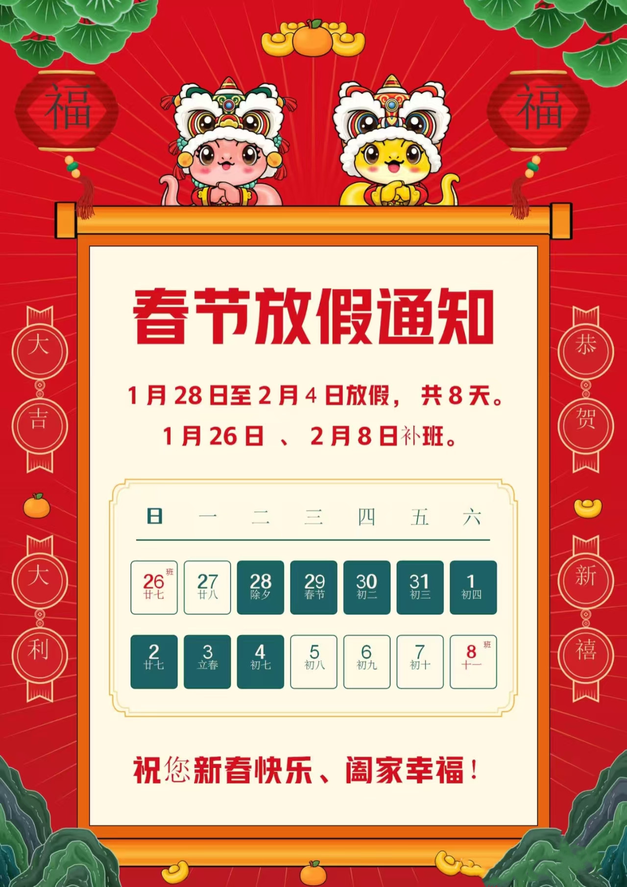一年一度的新春佳节即将到来,根据国务院放假办法,并结合我集团实际情况,现将集团春节放假安排通知如下:1、春节放假时间:2025年1月28日(除夕)至2025年2月4日(正月初七)放假,共8天。2月5日(正月初八)正常上班。其中1月26日、2月8日正常上班。2、放假前,各部门人…